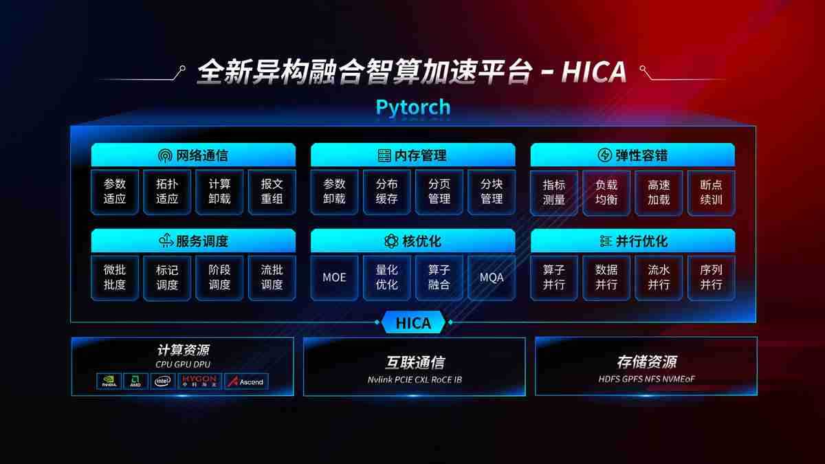 通过自研的服务层、、中间适配层、、、以及调度编排算法,,,,采用数据并行、、、、模型并行等多种并行方式,,把并行计算任务进行有效的分解,,,,使其分别由相应的软件栈和算力资源来承接。。。当GPU资源变化,,HICA可以实时动态调度计算子任务并调整模型拓扑和架构,,以充分聚合各种算力资源。。。